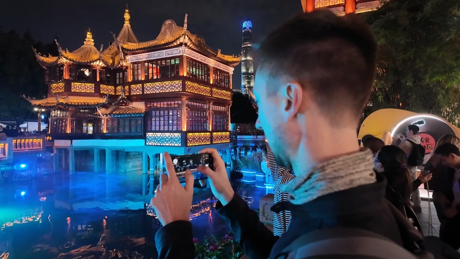 汤姆面对豫园夜景,不住感叹“Amazing”。