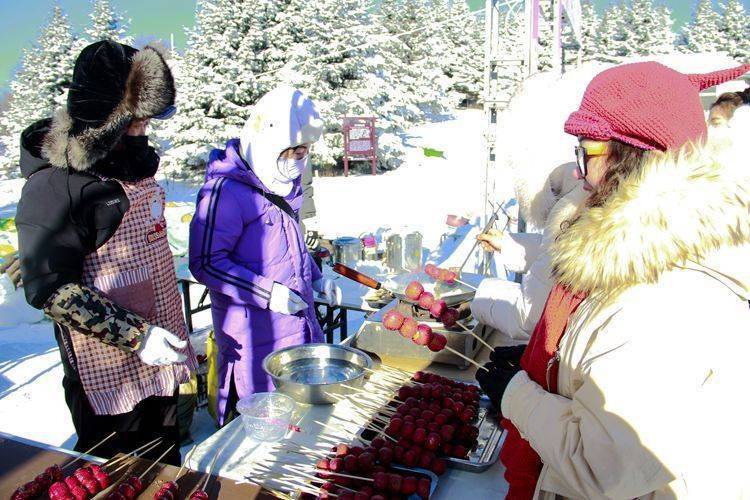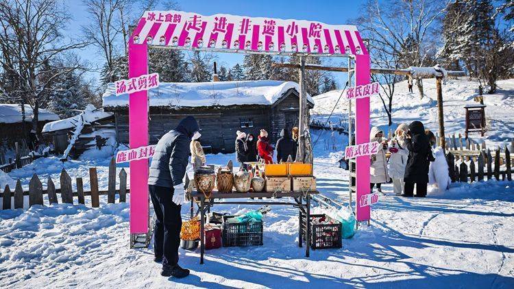 启动仪式后,现场举行了丰富的互动体验活动,包括民族歌舞快闪、吉他弹唱等演出,剪纸、铁艺、糖人等非遗技艺展示,以及雪地拔河、趣味套圈等冰雪游戏。此外,参鸡汤、关东煮等特色美食也为游客带来了温暖的味觉体验。游客们还在粉色雪景网红拍照点和温驯麋鹿互动区驻足打卡,定格浪漫瞬间。