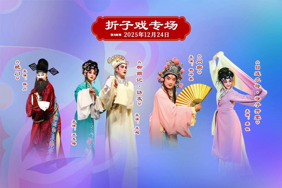 12月24日,折子戏专场则汇聚《跪门》《柳荫记·访友》《问病》《目连之母·寻子开荤》4折。《跪门》源自传奇川剧《绨袍记》,是丑角艺术为核心的代表性剧目。青年演员薛川将展现甩水发、膝步功等绝活。《柳荫记·访友》讲述感人至深的梁祝爱情故事,两位中国戏剧梅花奖得主王玉梅、王超联袂,讲述凄美爱情。《问病》是川剧传统戏。青年演员杨坤昊融合多种行当表演技法,形成“一人三面”的独特风格,展现了川剧新生代的底蕴。《目连之母·寻子开荤》始于800年前的传统戏《目连传》,后由剧作家徐棻以故事新编的方式改编,是梅花奖得主虞佳的“摘梅”曲目,将展现情感丰富的高腔和水袖功。